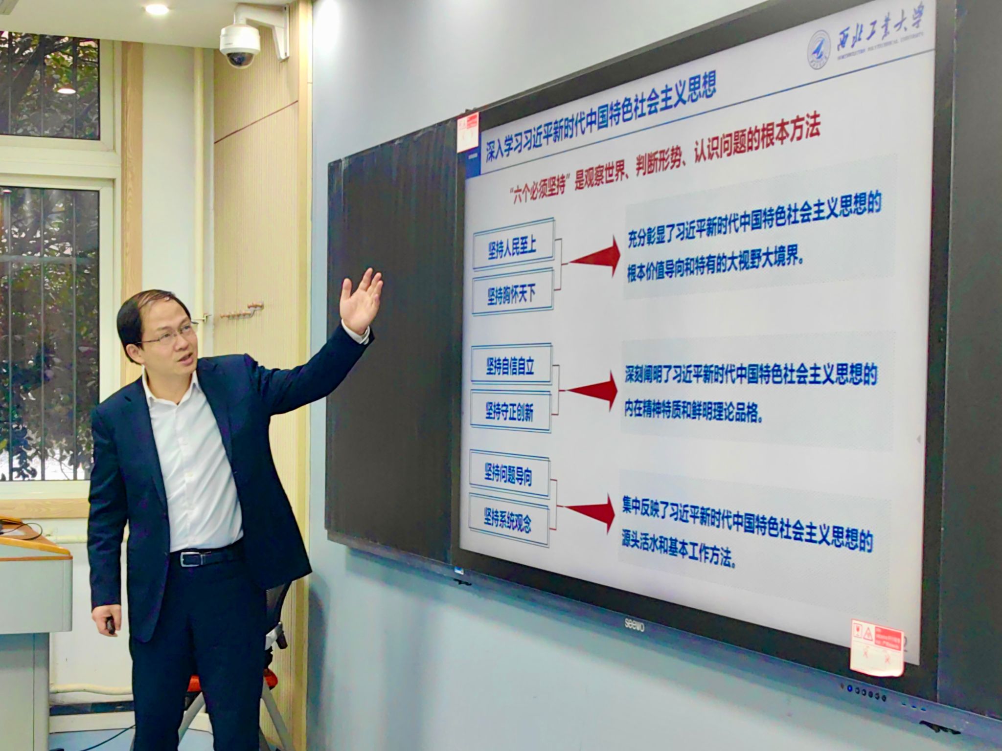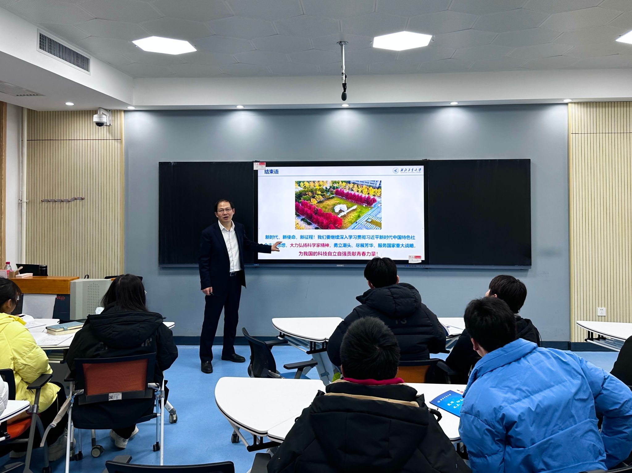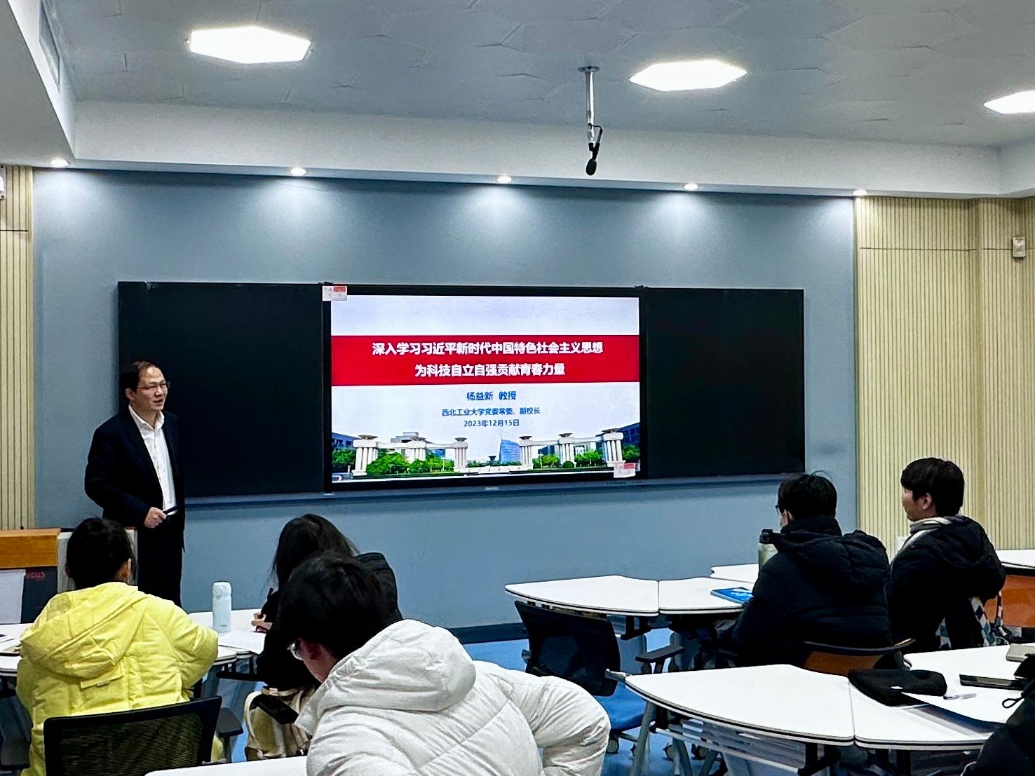12月15日下午,beat365亚洲体育在线官网特别邀请beat365亚洲体育在线官网党委常委、副校长杨益新教授为学院师生讲授主题为《深入学习习近平新时代中国特色社会主义思想,为科技自立自强贡献青春力量》的思政课,beat365亚洲体育在线官网党委书记孙华强、党委副书记王银涛、辅导员郭兵勇与学院大三年级预备党员共同聆听本次思政课。