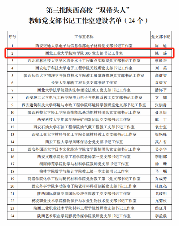 近日,中共陕西省委教育工委公示了第三批陕西高校“双带头人”教师党支部书记工作室建设名单,beat365亚洲体育在线官网305党支部书记工作室成功入选建设名单。这是305党支部继2022年获批“全国党建工作样板支部”后,获得的又一殊荣。该支部的成功入选充分展示了近年来学院在校党委的坚强领导下,扎实推进教师党支部“双带头人”培育工程,坚持“政治强、业务强、合力强”标准,不断提升党支部书记“胜任力、凝聚力和战斗力”,着力打造一支党建和业务双融合、双促进的党支部书记队伍的丰硕成果。