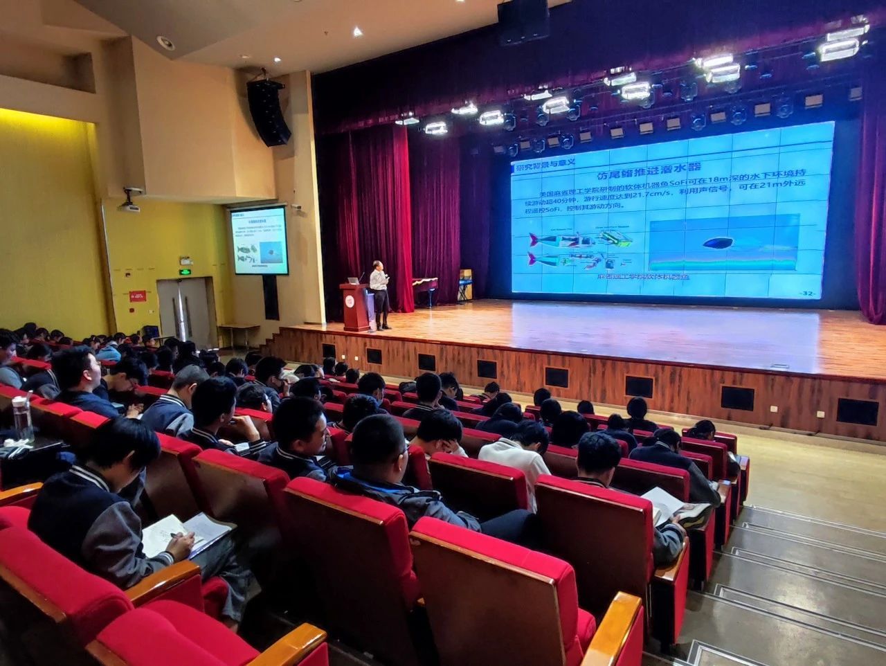 应上海复旦附中青浦分校邀请,5月15日下午,国家级教学名师、beat365亚洲体育在线官网院长潘光教授走进复旦附中青浦分校,为200多名高中生做了题为《仿蝠鲼柔体潜水器研制》的科普讲座。讲座内容丰富、深入浅出,赢得了阵阵掌声,为同学们种下了海洋科学的种子。