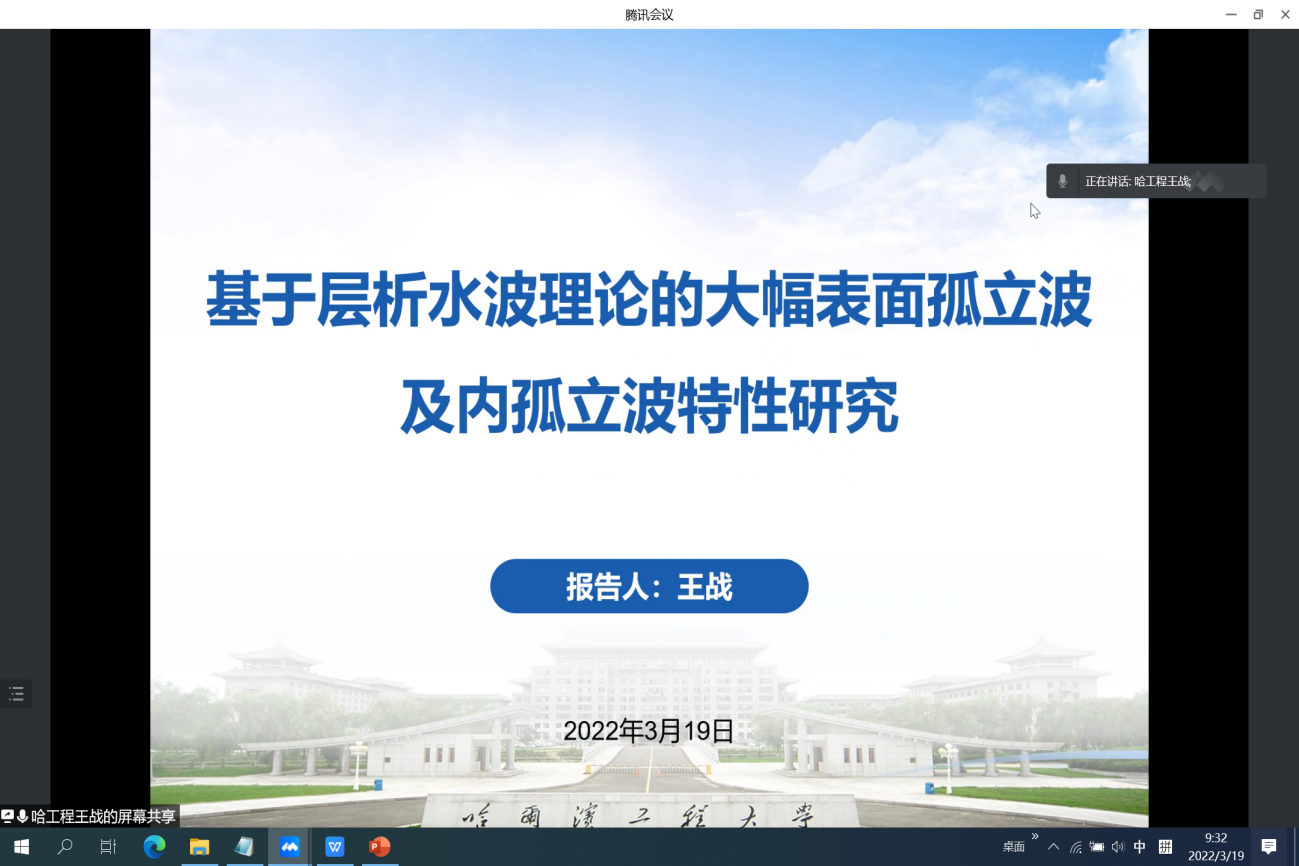 3月19日,应beat365亚洲体育在线官网杜鹏副教授的邀请,哈尔滨工程大学船舶工程学院和哈尔滨工程大学青岛创新发展中心联合博士后王站,在线上为学院师生作“航海大讲堂”系列讲座(十四)——《基于层析水波理论的大幅表面孤立波及内孤立波特性研究》的学术报告。会议由杜鹏副教授主持,学院10余名师生参会。