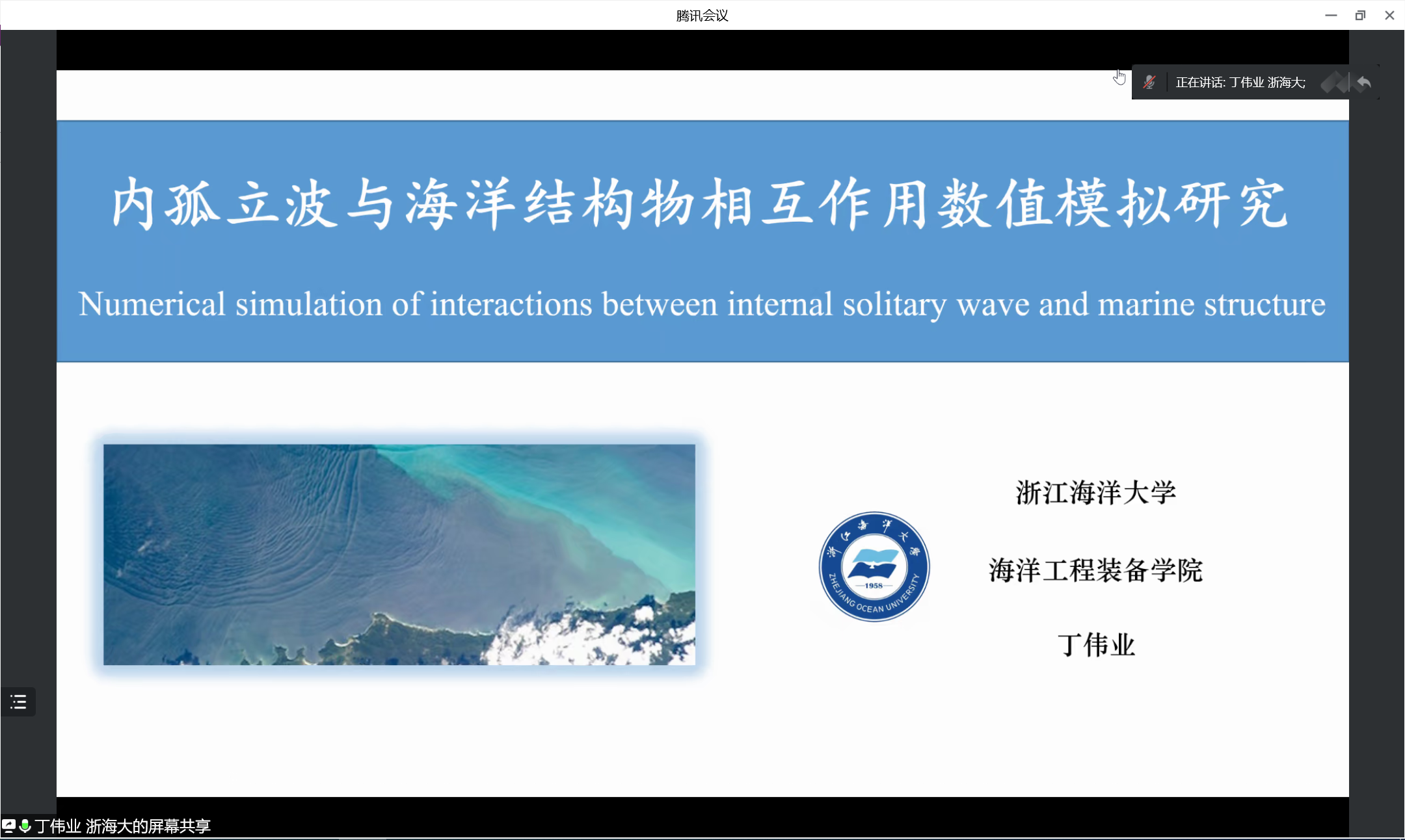 2022年6月15日,浙江海洋大学海洋工程装备学院丁伟业副教授应beat365亚洲体育在线官网杜鹏副教授的邀请,在线上为师生作“航海大讲堂”系列讲座(二十二)——《内孤立波与海洋结构物相互作用数值模拟研究》学术报告。会议由杜鹏副教授主持,新加坡国立大学、浙江海洋大学、本校beat365亚洲体育在线官网等校内外师生参会。